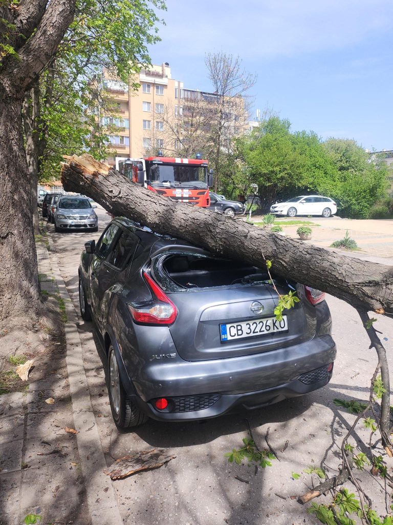 От снимки във фейсбук групата „Катастрофи в София“ става ясно, че автомобилът е с мащабни щети, след като старо дърво е рухнало върху него.