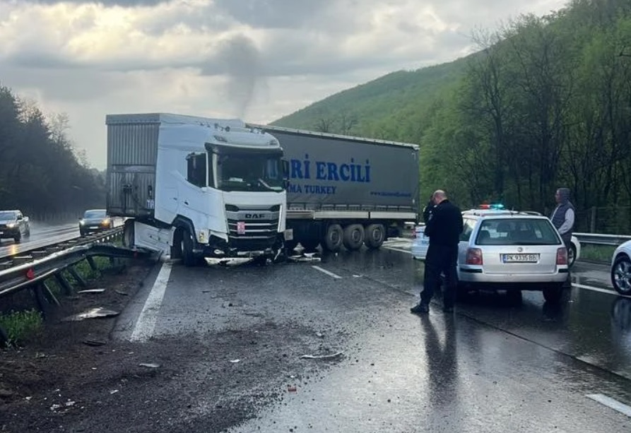 Камионът се е завъртял като е направил почти обратен завой. Той се е ударил в мантинелата и е откъртил част от нея. Ремаркето на камиона е запречило цялото платно.