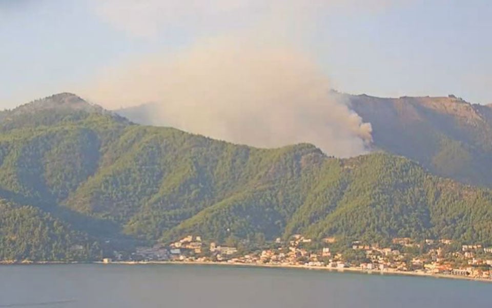 Голям горски пожар, избухнал късно снощи в горските части на гръцкия остров Тасос, продължава да гори и тази сутрин.