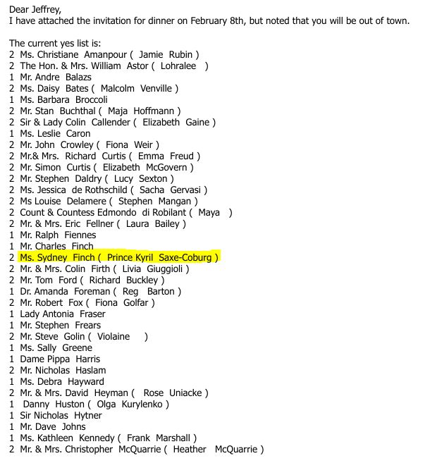 В списъка с гости фигурира и принц Кирил Сакскобургготски, посочен като придружител на Сидни Финч.
